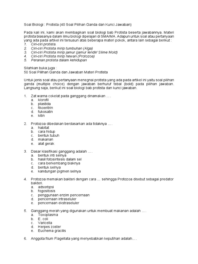 Soal Biologi Protista 40 Soal Pilihan Ganda Dan Kunci Jawaban
