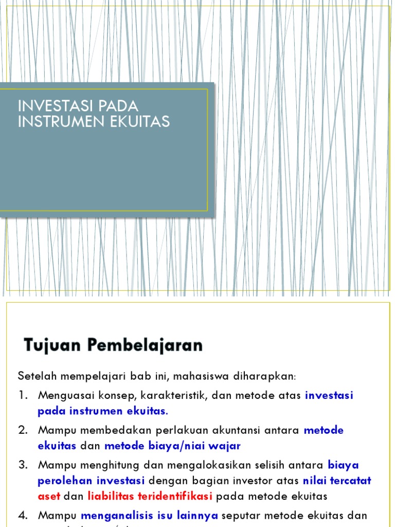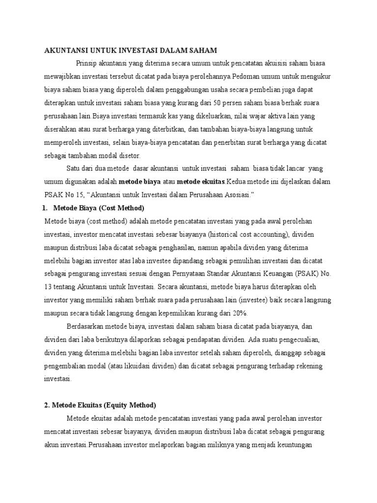 Nilai investasi ditambah atau dikurangi dengan bagian labarugi investor pada perusahaan asosiasi1 setelah tanggal perolehan. Metode ekuitas adalah metode pencatatan investasi yang pada awal perolehan investor mencatat investasi sebesar biayanya dividen maupun distribusi laba dicatat sebagai pengurang akun investasi. Metode ekuitas juga harus digunakan oleh investor yang investasinya dalam saham berhak suara memberinya kemampuan untuk berpengaruh besar terhadap kebijakan operasi dan keuangan investee meskipun investor tersebut hanya memilki 50 atau kurang 50 dari saham berhak.