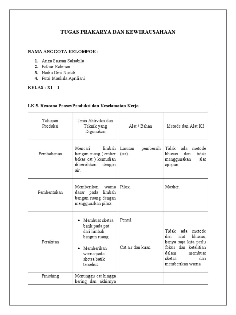 Mohon Di Jawab Rencana Proses Produksi Dan Keselamatan Kerja Tahapan Produksi Jenis Teknik Aktivitas Yg Digunakan Alat Bahan